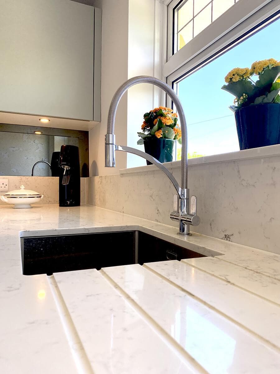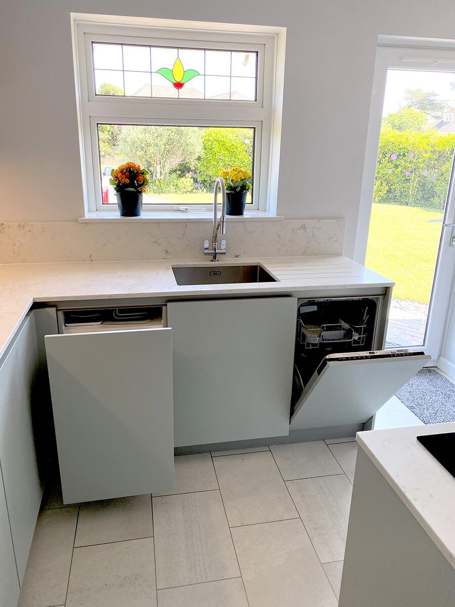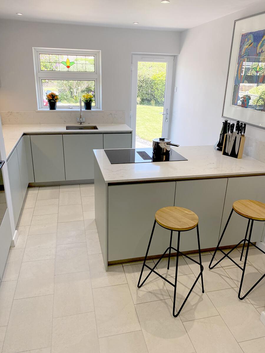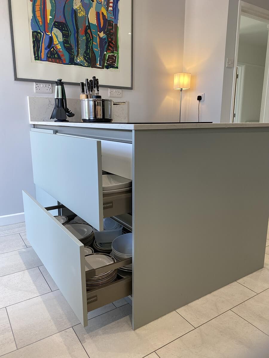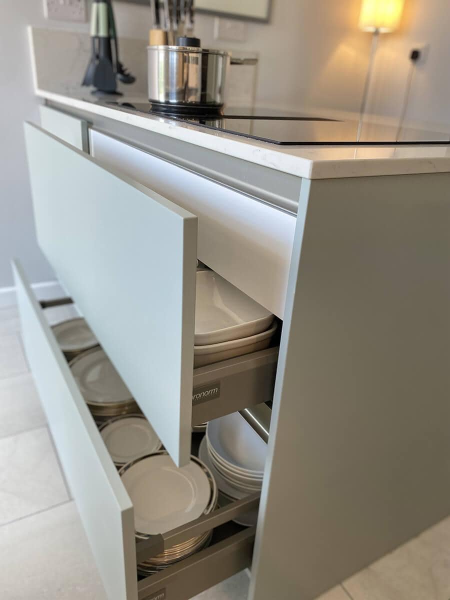 The owner of the coastal chalet bungalow came to us after being referred by a friend. The client wanted to create a bright and open space with more worktop space than she had previously with better-functioning storage, maximising drawers and interior pullouts rather than fixed shelved cupboards.