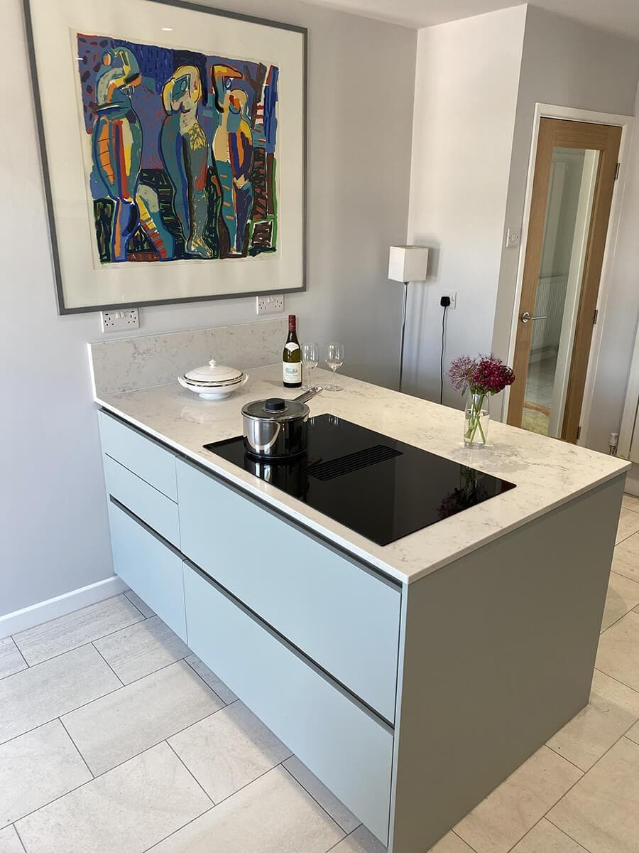 The client of this coastal chalet bungalow located at Barton-On-Sea wanted a light and contemporary kitchen but without the normal whites and grey tones. The client had a contemporary painting that held a sentimental value to them and enjoyed the colours in it, the main kitchen colour was taken from the picture as inspiration.