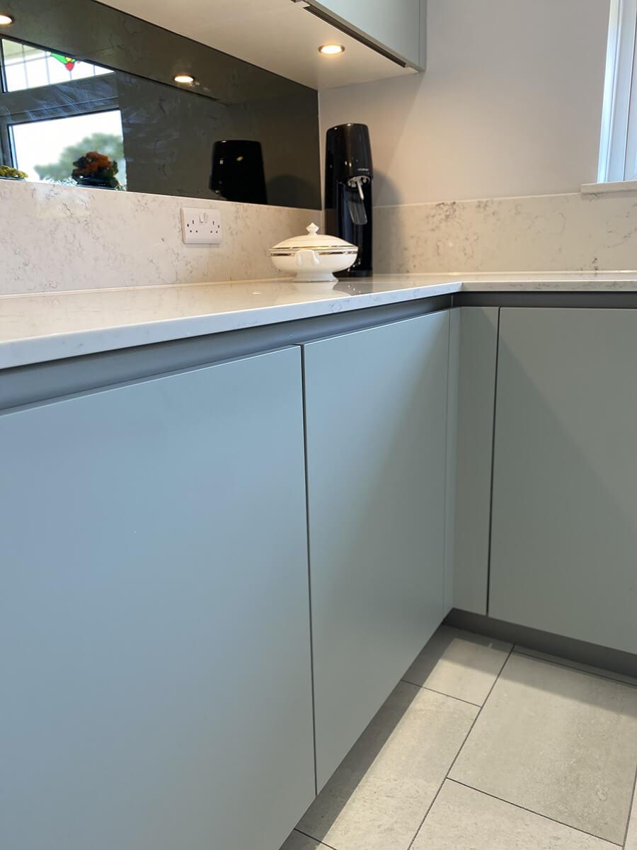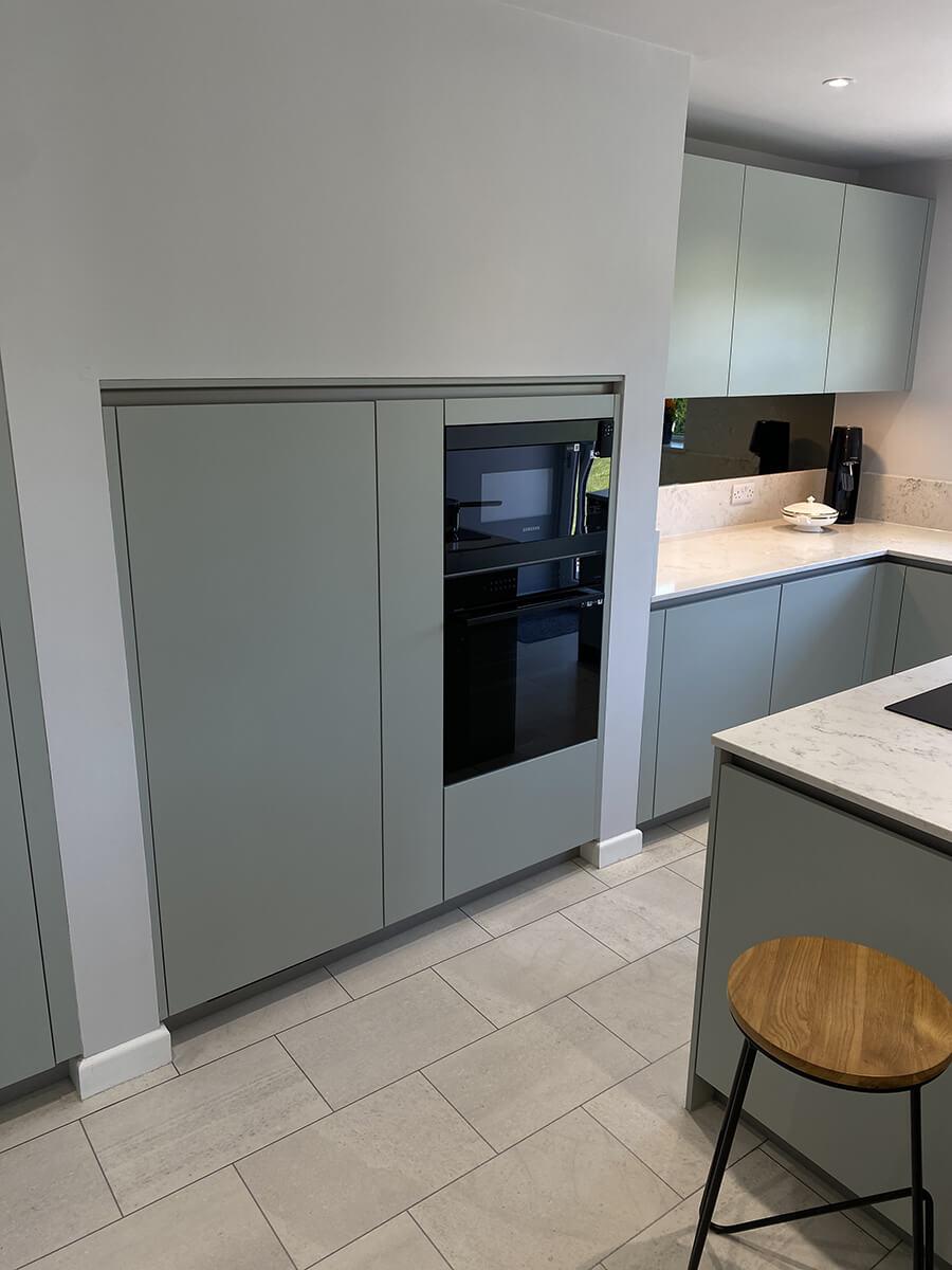Pronorm provides expensive customisations to their kitchen cabinets so we had the option to provide specially sized units for the difficult area to create as much symmetry and to keep the design as minimal as possible. The kitchen was provided in X-LINE LM with a lacquered door that’s finished in green-grey. We then complemented this colour with a quartz worktop that was chalky off-white with mottled veins and a mirrored splashback directly under the illuminated wall units that finished the whole space off.