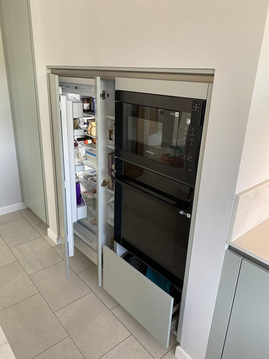 As we had to work around an existing chimney stack we soon had to factor in several important areas of the kitchen, the locations for the boiler, ovens, fridge, and freezer all within a confined space. We decided it was best to use the height of the interior section of the chimney to utilise the fridge and ovens, leaving the remainder of the kitchen for under-counter appliances to maximise the worktop potential.