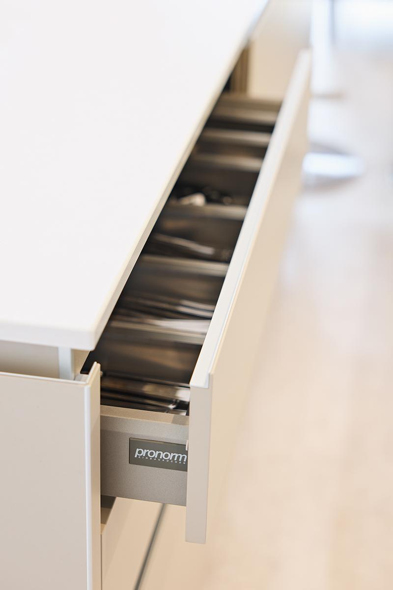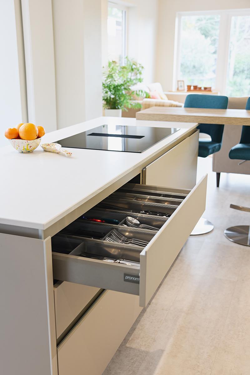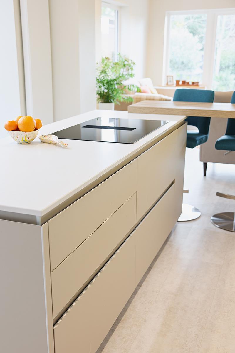 For the furniture, we selected Pronorm Y-LINE, known for its distinctive handleless profile where the back of the door is milled into an anodized profile and seamlessly finished with the door material, serving as the dividing rail. The kitchen predominantly features MP Ultra matte angora, contrasted subtly yet effectively with the island finished in MP Ultra matte stone grey. The island area also includes a 50mm block wood effect breakfast bar, creating a clear separation between the different zones of the kitchen.