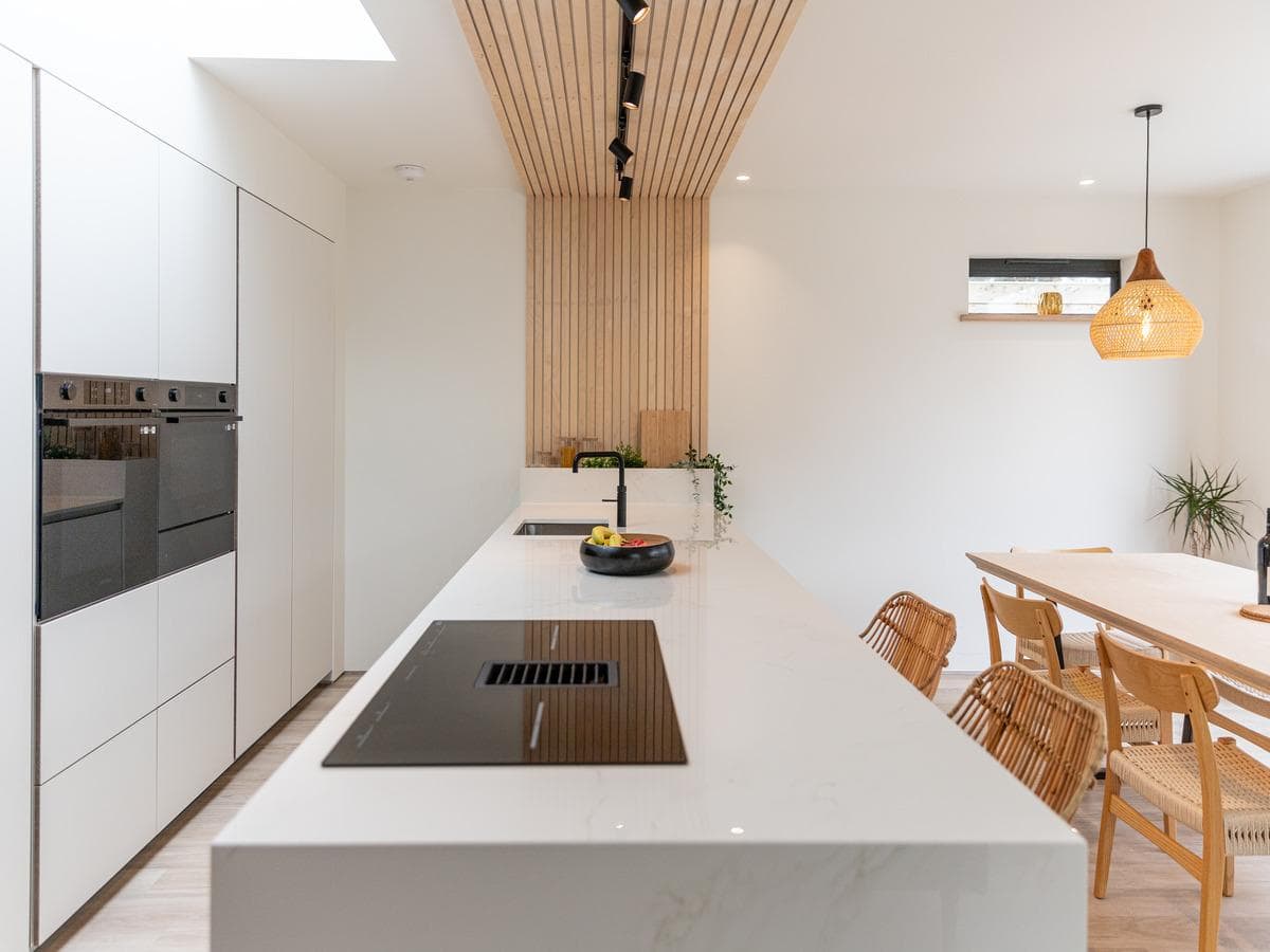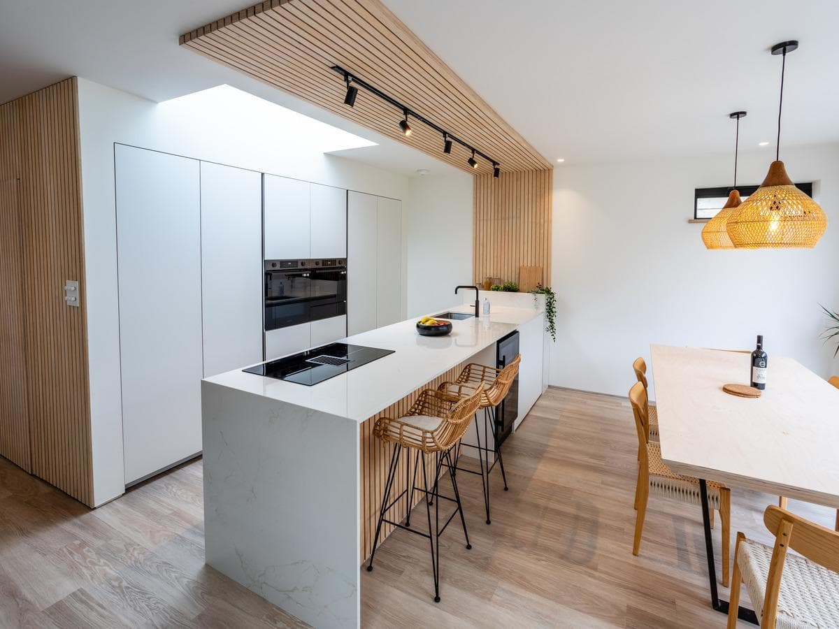 Our recently completed project perfectly embodies the design brief provided by our client, who sought a light, contemporary open-plan kitchen and interior that feels both homely and warm. The project reflects a luxurious Scandinavian aesthetic, incorporating wooden elements, panelling, and white hues to create a sophisticated yet inviting atmosphere.