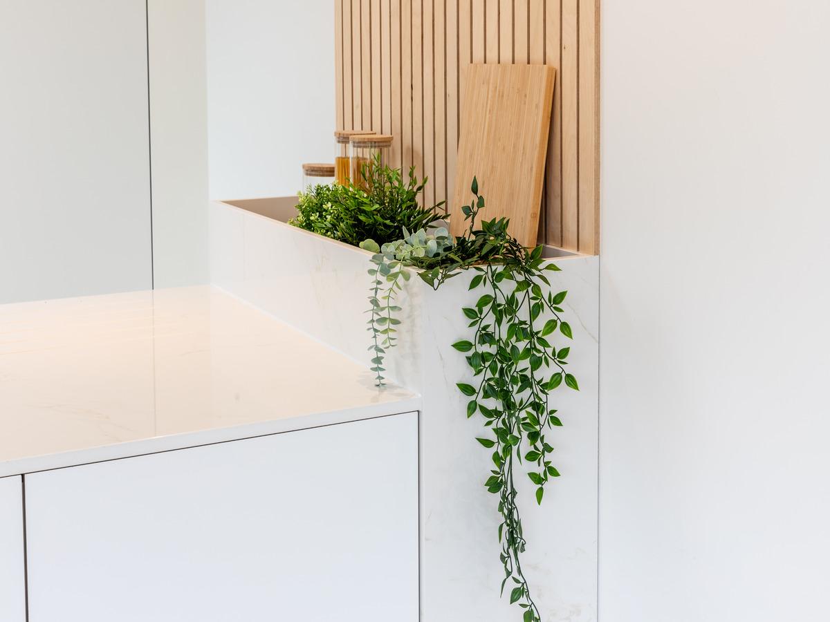 The peninsula spanned 3.6 meters in length, with the cabinets below providing optimal storage, including wide pan drawers, interior bins, and a dishwasher beside the sink. The setup was finished with a bespoke Mired herb box integrated into the Dekton worktop. Other design elements included using the wall cladding on the back of the island to balance the client’s choice of bar stools and pendant lighting in the dining area.