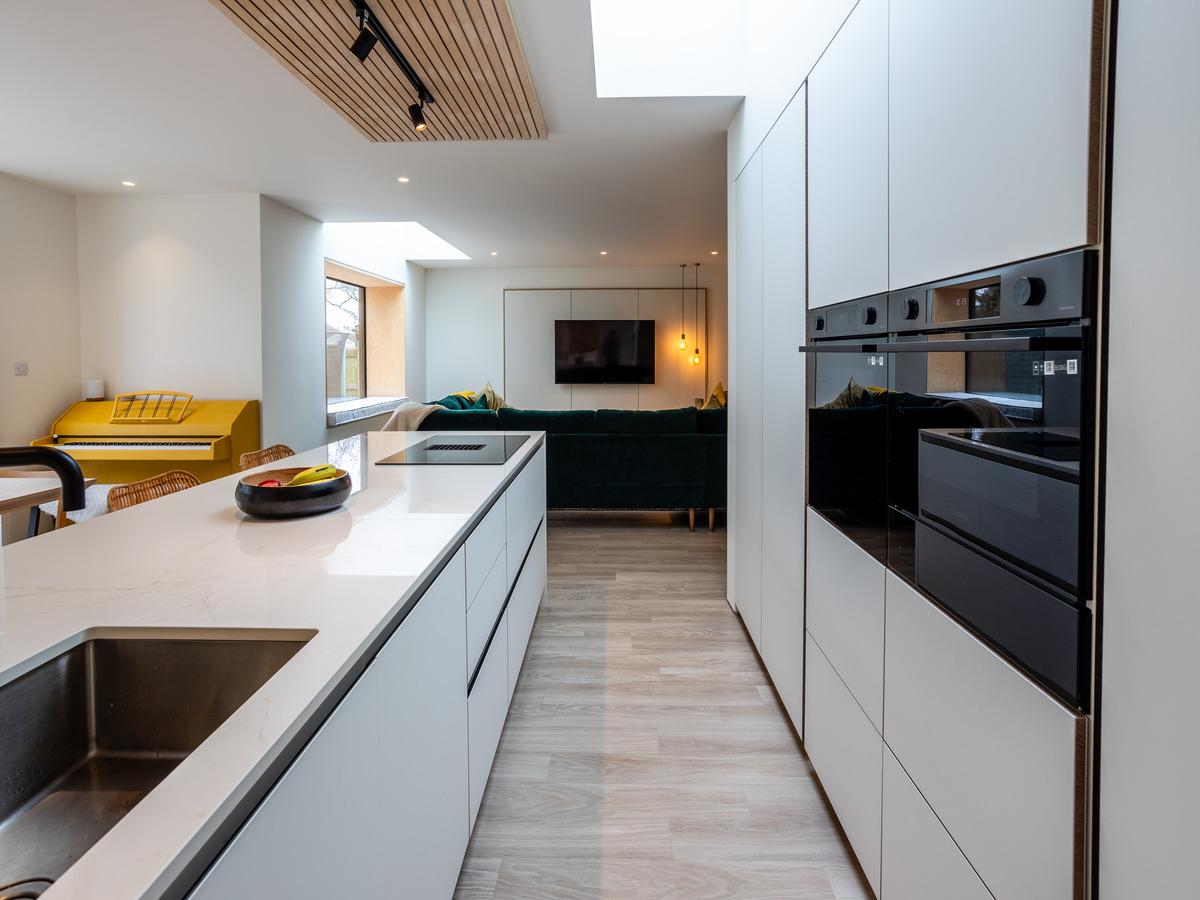 Given the luxury contemporary theme with Scandinavian elements, we explored several kitchen layouts. We decided to inset the tower units into a plastered frame, creating the illusion that the larder units were set into the wall. This approach provided a clean finish and served as a stunning focal point, with different sun angles highlighting the staggered skylight directly above the walkway between the tall units and the expansive peninsula design. It was imperative that the cooking area had a direct view of the newly landscaped garden and was within the vicinity of the dining area.