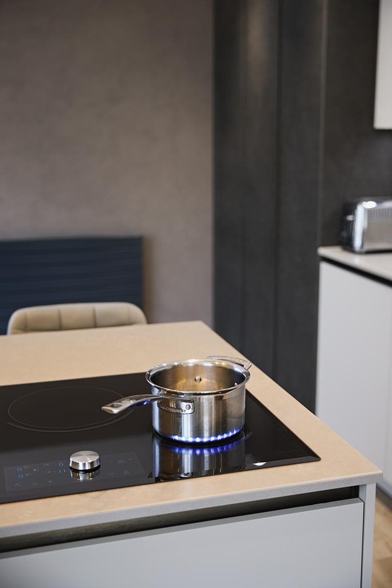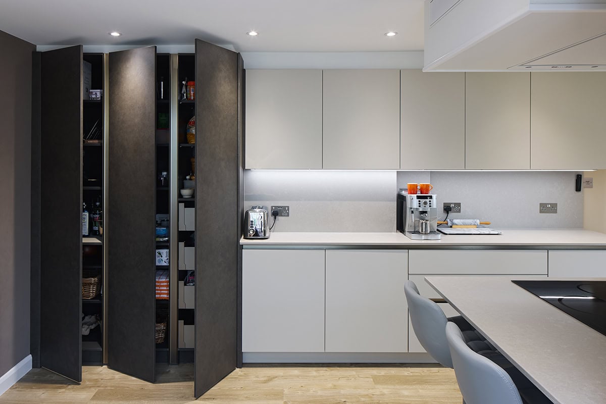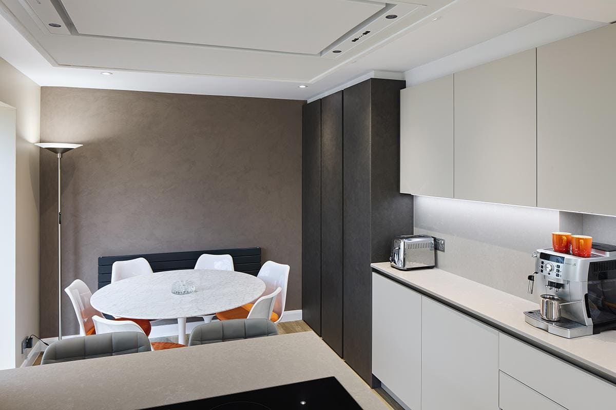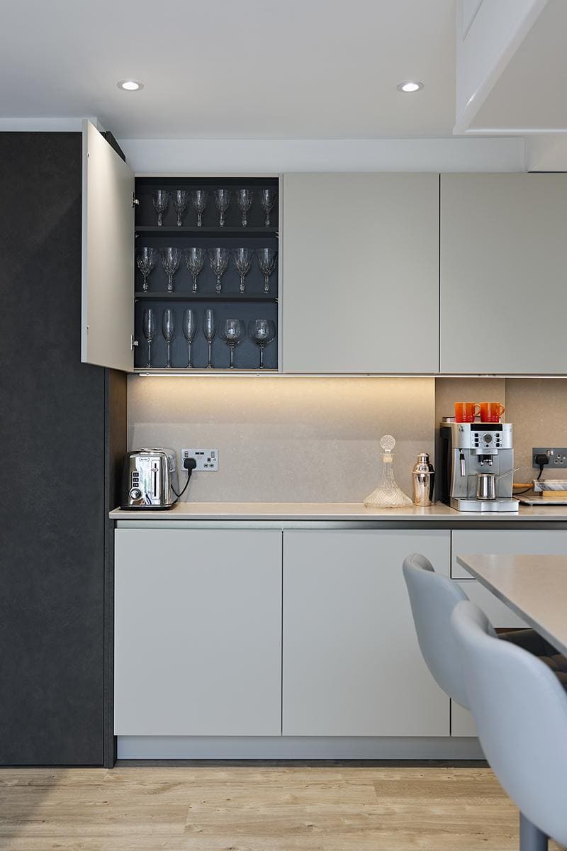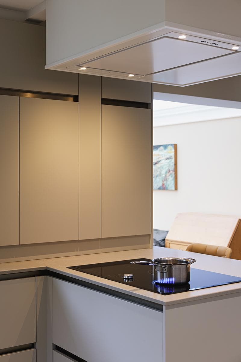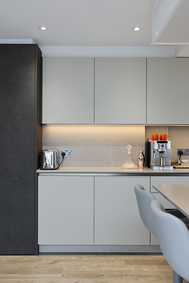 The kitchen design for our client was to embrace a contemporary aesthetic, predominantly utilising light grey hues to create a sophisticated and calming environment. Feature areas will be strategically integrated to add visual interest and character. Prioritising ample storage, the design will include a variety of solutions such as deep drawers, tall larder units, and other innovative storage options to maximise usability and convenience. The cabinetry will extend to the ceiling to provide additional storage and a seamless look. Considering the client’s passion for cooking and frequent travels, the kitchen will be equipped with top of the line appliances, ensuring a professional-grade culinary experience. Given the client’s preference for Asian cuisine and steamed dishes, the design will incorporate a steam oven providing versatility and precision in cooking.