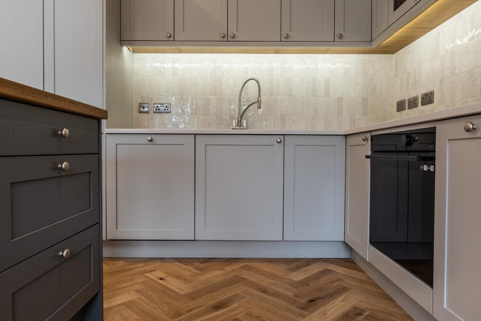 To create a homely kitchen and open-plan living area that celebrates the property’s heritage and beautiful views. Incorporate similar cabinets in the kitchen area to what the client has in their home town Melbourne Australia, using mid and dark grey units but with light oak interior cabinets and drawer boxes to compliment the solid wood herringbone floors and exposed bespoke oak beams. They wanted to replicate elements from their farmhouse in Australia.
